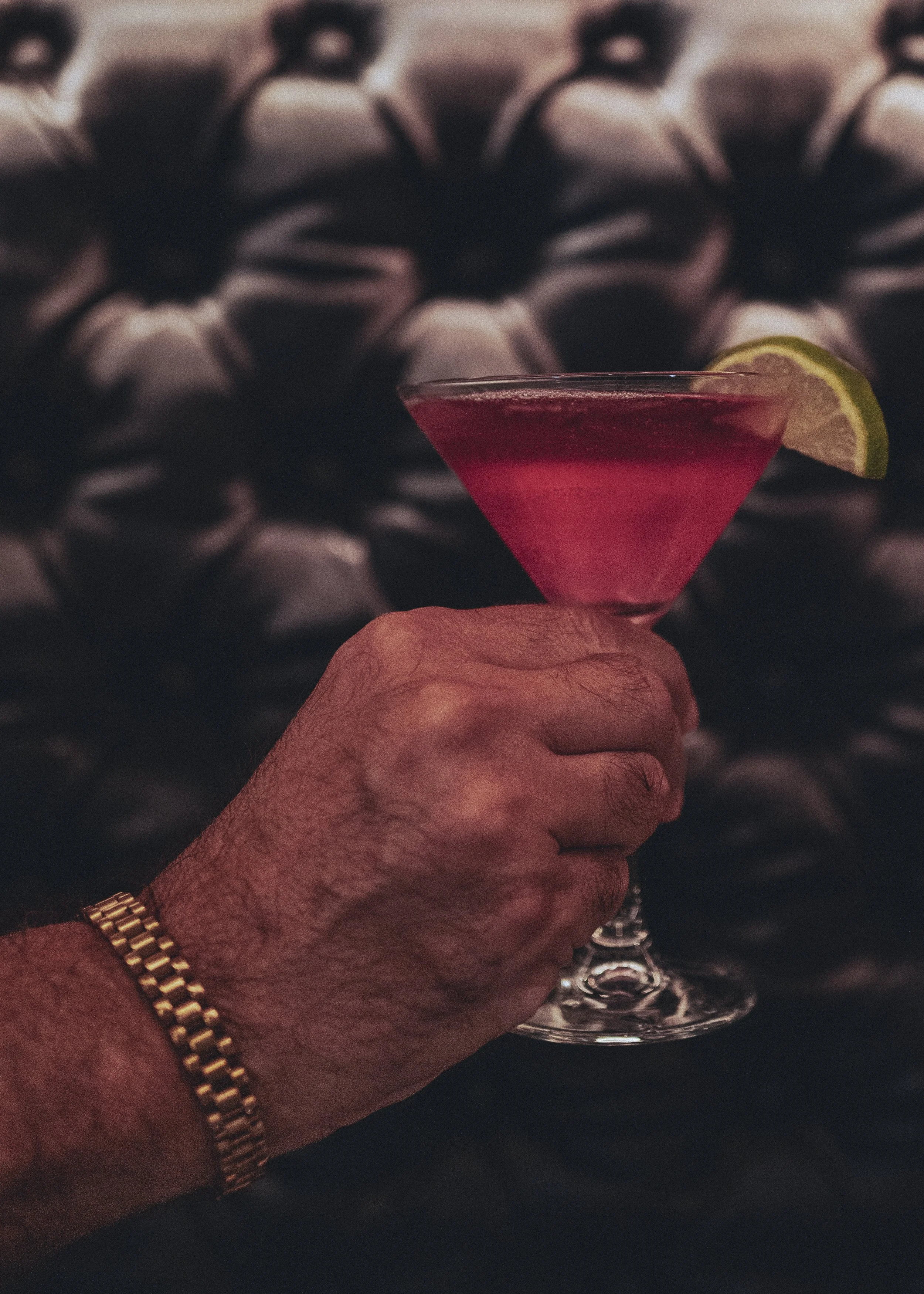A hand holding a pink cocktail glass with a lemon wedge garnish, against a dark, textured background.